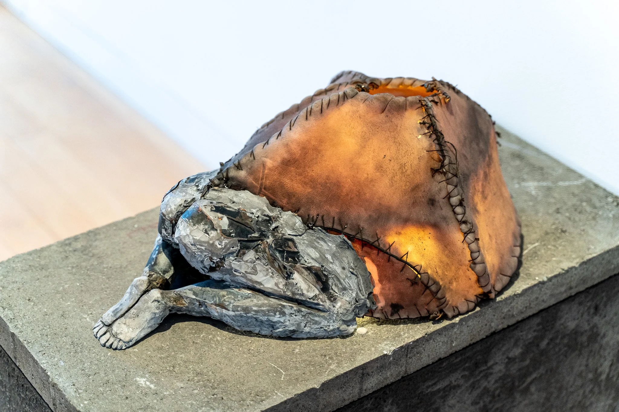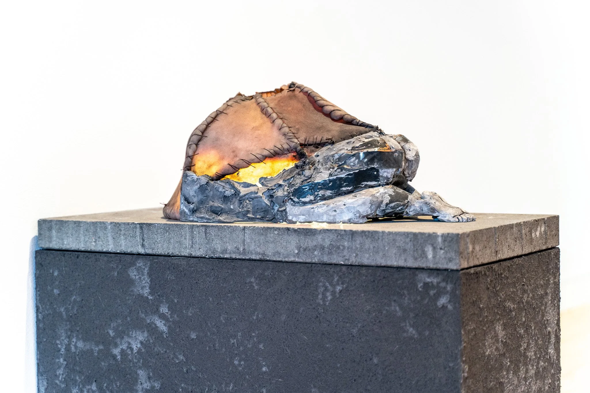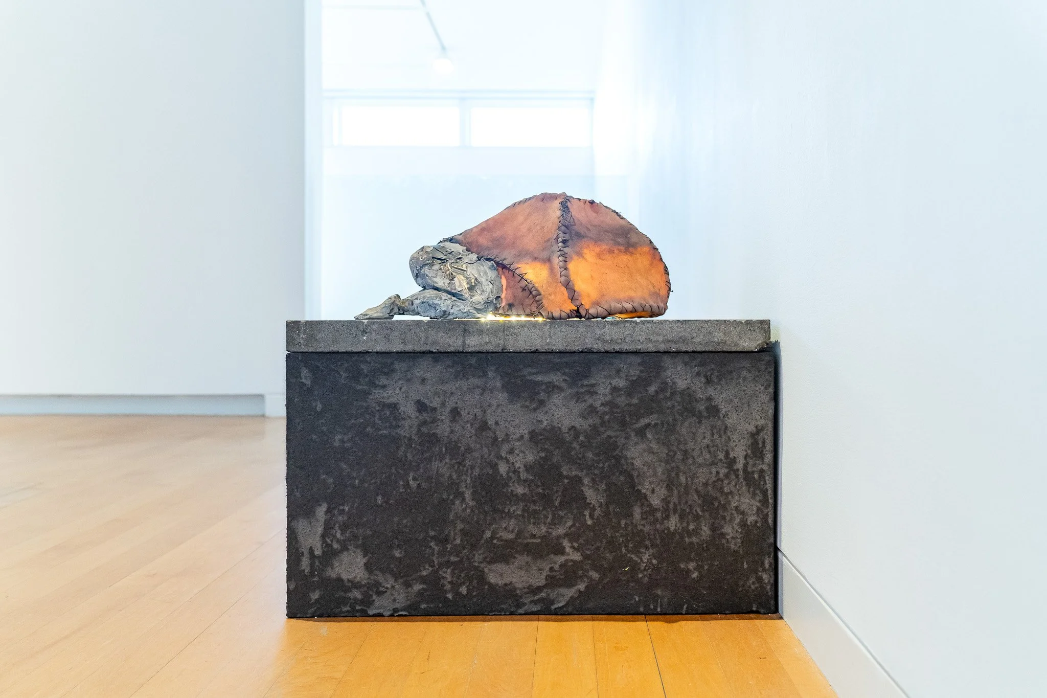 Chiffon Thomas, Untitled (fetal), 2023. Hydrocal, silicone, embroidery thread, steel wire, cement, tin, copper, LED light. 9 x 15 x 22 (without cement slab), 12 x 15 x 30 (with cement slab). Courtesy of the artist and Kohn Gallery, Los Angeles.